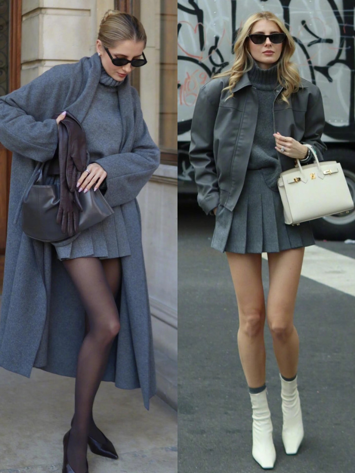 体魄高挑的女子最稳妥利落又飒爽的穿搭,零丁灰色压褶短裙,内搭灰色至意毛衣,外披一件酷感总共的皮衣,淘气中藏着仁和。
