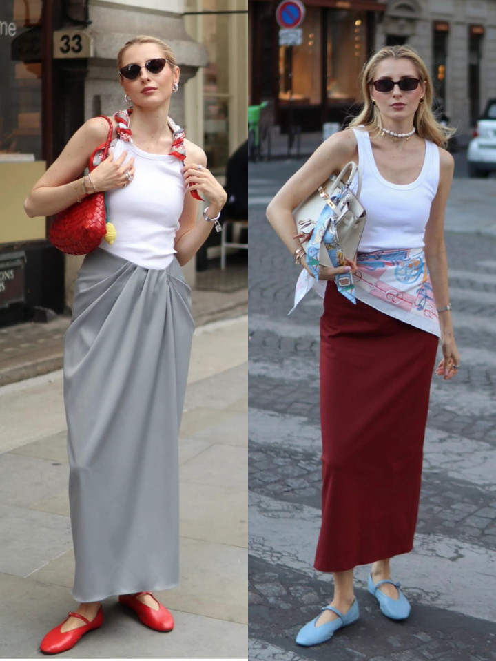 或是白背心配红色直筒半裙,踩一对雾霾蓝低跟玛丽珍鞋,腰间再系一条丝巾,别致又有脉络感,恣意碎裂单调。