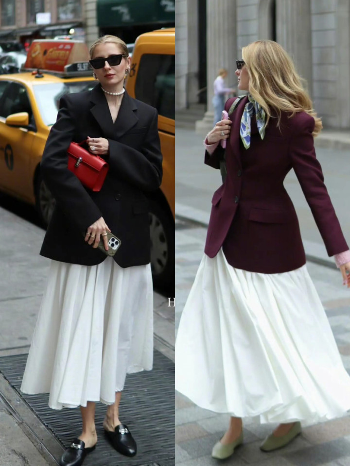 不异是穿了一条白色的伞裙,换件西装即是不一样的气质。玄色西安装白色伞裙,脚上踩玄色穆勒鞋,经典来看,再拎一只红色包包,复旧感总共。