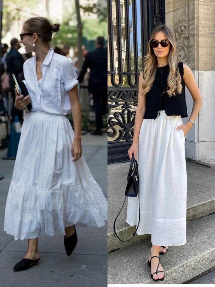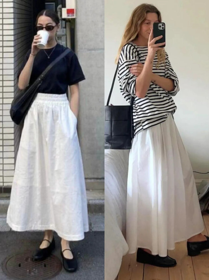 最通俗的穿搭连续最动东谈主,一袭白色棉麻衬衫配一条白色伞裙,脚踩一对玄色低跟单鞋,干净又利落,就像春日里的一缕清风,勤俭又大方。