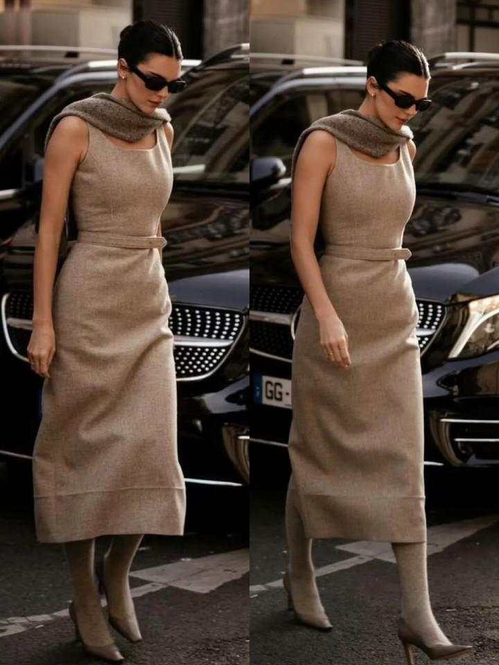 或是弃取燕麦色的宽肩连衣裙,脚踩一对浅口高跟鞋,内搭同色系的御寒打底袜,穿的时辰再勒上腰带,就能呈现高挑体魄和落魄体态。