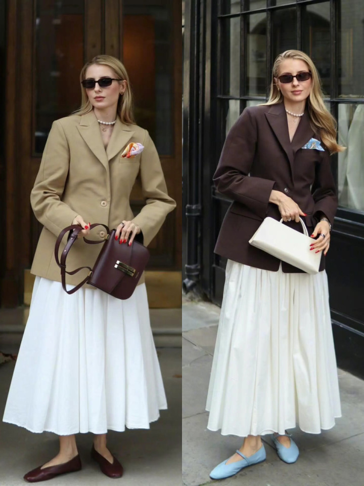也不错弃取卡其色的西装外衣粗犷是棕色的西装外衣,来搭配上这条白色的压褶伞裙。呈现出更高档文明的造型。不外西装外衣一定要选高腰收腰款。同期面料挺括有型。穿在身上更显品性。