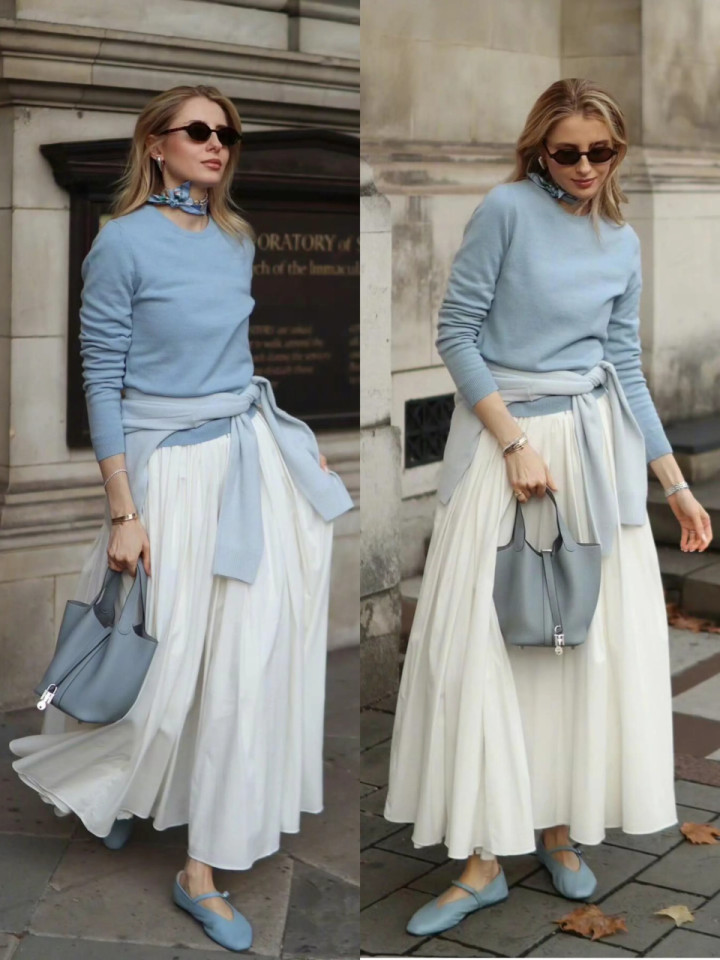 或是弃取雾霾蓝的至意上衣,搭配上一条白色伞裙,脚上穿的雾霾蓝的玛丽珍鞋正值和一稔酿成颜色呼应,让举座配色更互助。