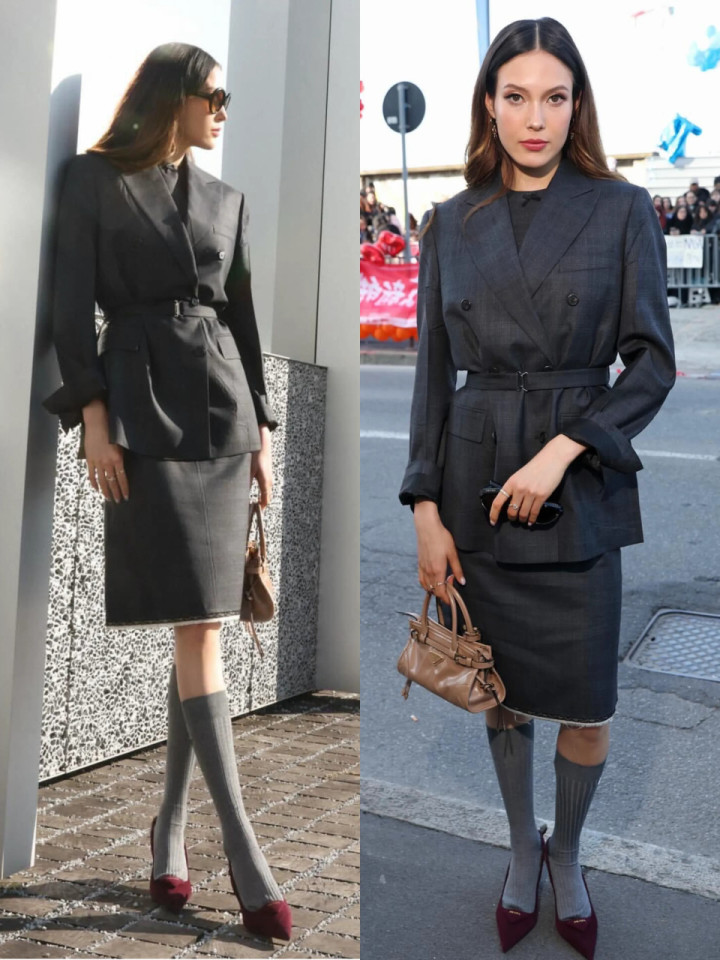搭配紫红色浅口高跟鞋与灰色中筒袜,亮眼又把稳。
