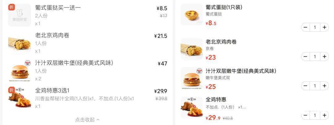 以广州多家门店在第三方平台的价钱信息为例,薯条(中份)原价为14元,价钱诊疗后为15元;醇香土豆泥原价为9元,现价为10.5元;新奥尔良烤翅原价15.5元,现价16元;老北京鸡肉卷原价21.5元,现价23元;汁汁双层嫩牛堡原价23.5元,现价25元;葡式蛋挞、全鸡价钱保握不变,已经远隔为8.5元、29.9元。